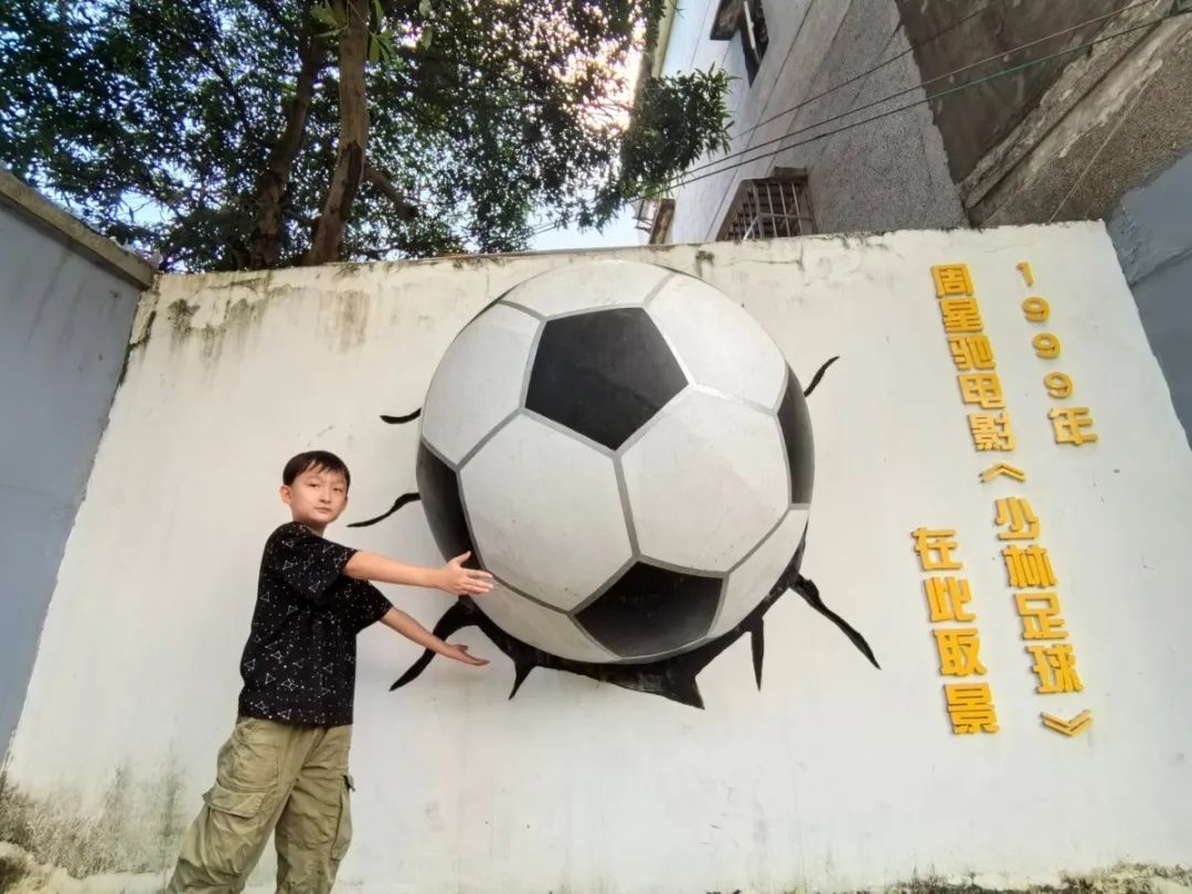 走出春芳理发店,巷口那面灰白围墙便猝不及防闯入视线——斑驳墙皮间,一颗足球竟像被一脚凌空抽射,半颗球体嵌进墙体,裂缝沿着球缘蔓延,让经过的人都不自觉停下脚步:二十六年前,《少林足球》也曾在这里上演精彩的一幕。