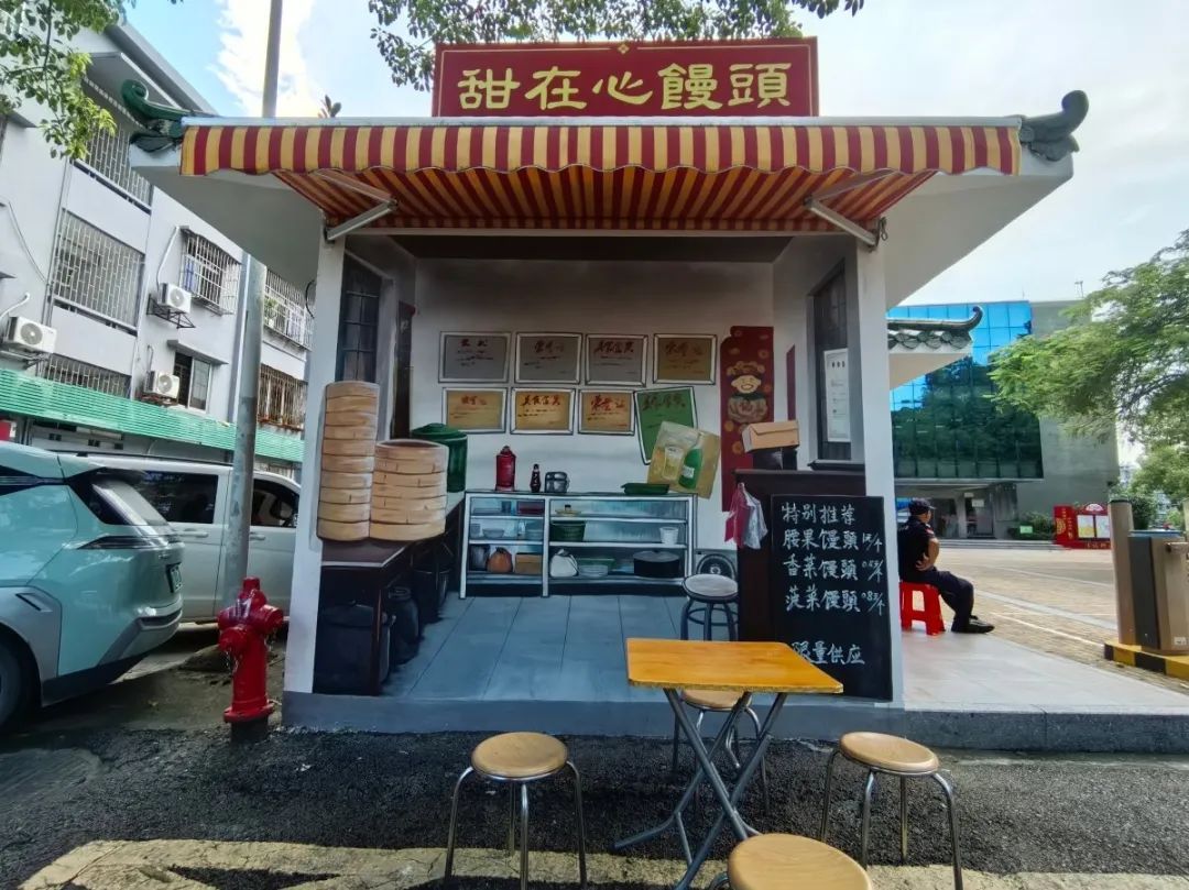 在其对面,影片中人声鼎沸的“甜在心馒头店”如今变成狮山市民艺术中心的保安亭,偌大的墙面像时光幕布般,被绘制出了巨幅墙绘,把热气腾腾的蒸笼、香气扑鼻的馒头活灵活现地还原出来。路过的游客虽然不能再排队买馒头,但依然拥有打卡拍照的独特地标。