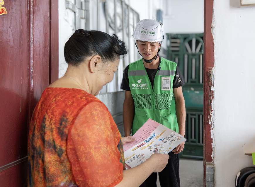 “李姨,您买的东西送到啦。最近各个社区都在抓紧开展灭蚊防蚊工作,我这里有一张防疫宣传单,您也看看了解一下如何居家防蚊,保护好自己的健康安全。”穿着绿色工服的朴朴超市小哥小王将李姨的订单送达后,随手从包里拿出了一份宣传手册。