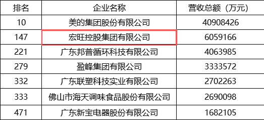 其中,宏旺控股集团有限公司以营业收入605.917亿元,排名总榜单第199位,较去年前进24名,排名佛山入围企业第二位。