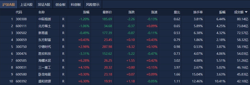 沪深两市半日成交额1.14万亿元,较上个交易日放量513亿。个股方面,中际旭创成交额超80亿元居首,北方稀土、新易盛、东方财富成交额靠前。