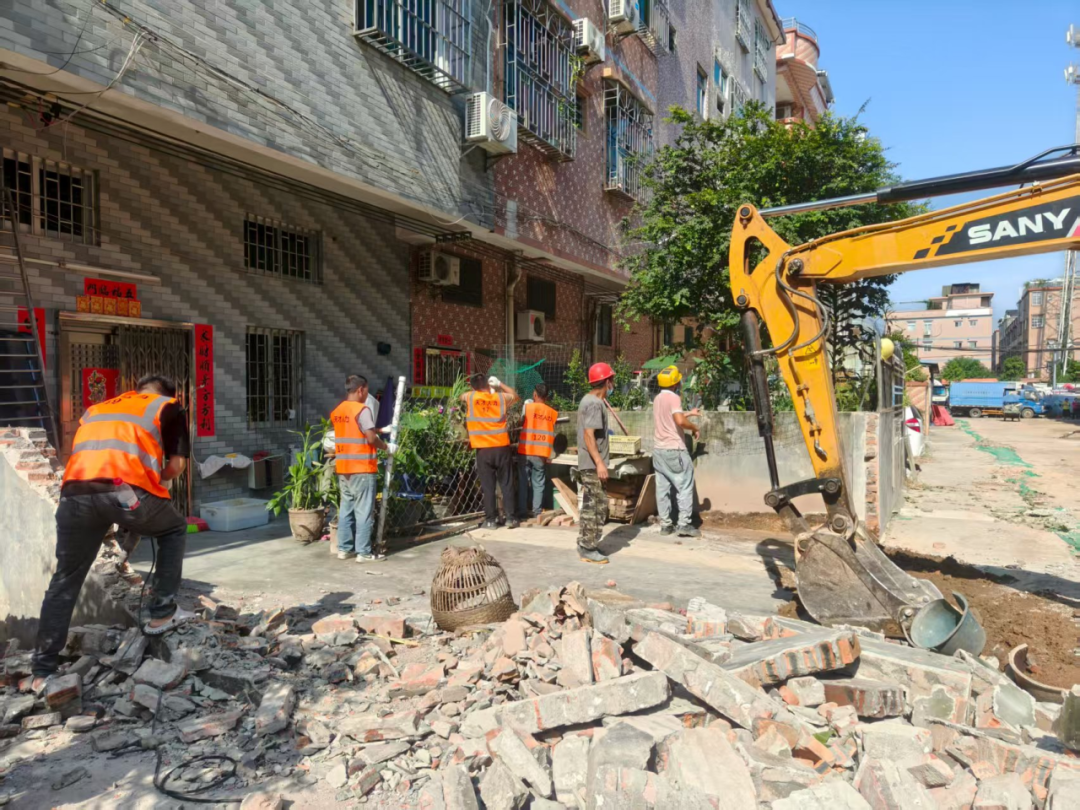 对于违建破坏街道整洁的情况,村(社区)组织专业人员调配铲车,对长期占用公共空间、易积水藏污的违建及违规鸡棚集中拆除。工作人员依规作业,同步清理废料与养殖设施,消除孳生隐患。